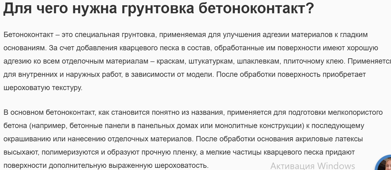 Бетон-Контакт адгезионная и гидроизолирующая грунтовка для подготовки поверхностей (монолитного и ячеистого бетона, гипсокартона, древесно-брусчатых плит, кирпича и камня) перед нанесением различных тяжелых декоративных покрытий.