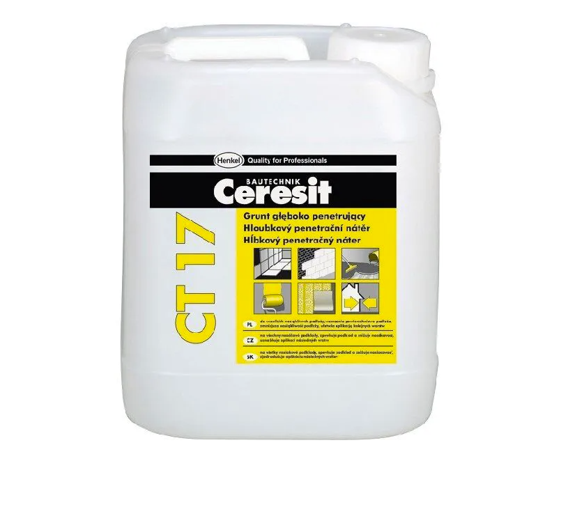 Ceresit CT 17 ProFiGrunt применяется для поверхностного укрепления и пропитки пористых, непрочных и сильновпитывающих минеральных оснований (легкий бетон, штукатурка, гипсовые и кирпичные поверхности) внутри и снаружи зданий перед укладкой керамической плитки, приклеиванием теплоизоляционных плит, шпатлеванием, оштукатуриванием, окраской, устройством самонивелирующихся цементных покрытий на полах. Ceresit CT 17 ProFiGrunt особенно рекомендуется для грунтования ангидритовых, гипсовых, ячеисто-бетонных оснований. Грунтовка проникает в основание и связывает зерна наполнителя, однако при этом не увеличивает прочностные параметры по всему сечению основания.