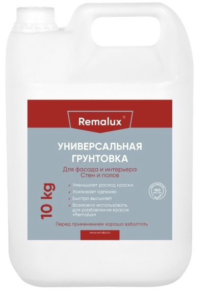 Товар "Грунтовка универсальная для фасада и интерьера т.м. Remalux канистра 5кг" является многофункциональным продуктом, предназначенным для подготовки поверхностей перед окрашиванием или дальнейшей отделкой.