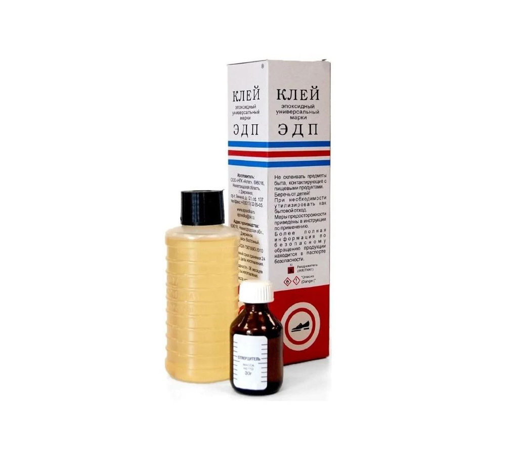 Клей эпоксидный универсальный марки ЭДП предназначен для склеивания при температуре от +10°С до +30°С металлов и их сплавов, древесины, керамики, фарфора, стекла, декоративно-облицовочных и других материалов, а также для заделки пор, трещин, раковин при ремонте домашнего инвентаря и автомобилей. Приготовленный клей годен к использованию в течение 1.5-2 часов. Для полного отверждения при комнатной температуре 20-25°С требуется 24 часа. Свойства: характеризуется очень высокой механической прочностью, малой усадкой, высокой адгезией к материалам, влагостойкостью, отличными электроизоляционными свойствами.