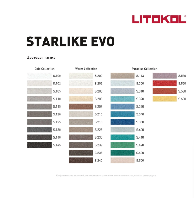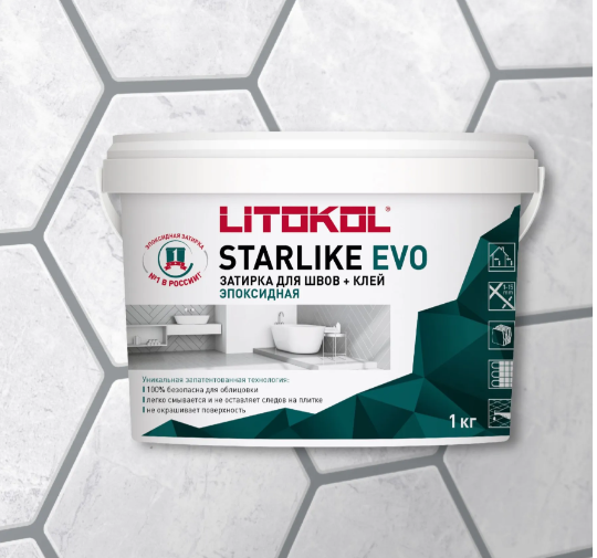 STARLIKE EVO двухкомпонентный эпоксидный кислотостойкий, щелочестойкий состав для затирки межплиточных швов с шириной шва от 1 до 15 мм и использования в качестве клея для всех видов облицовочной плитки и мозаики.Компонент А представляет собой смесь эпоксидной смолы, цветных микросфер и специальных органических добавок. Компонент В — инновационный органический катализатор (отвердитель).После смешивания компонентов А и В получается кремообразный состав удобный в работе. После полной полимеризации обладает непревзойденной гладкостью поверхности шва, высокой стойкостью к механическим воздействиям и превосходной химической стойкостью.